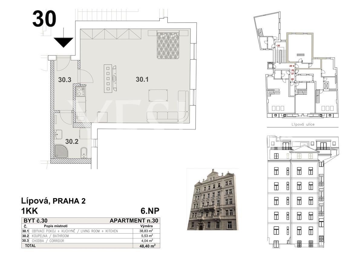 Pronájem luxusního, nezařízeného bytu 1+kk, 48 m2, Lípová, Praha 2 - Nové Město.