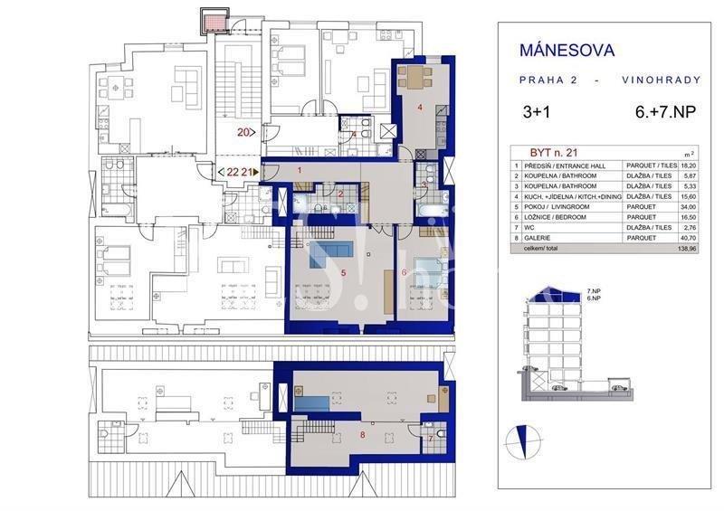 Luxusní, kompletně nově zrekonstruovaný, půdní, mezonetový, plně klimatizovaný, nezařízený byt 3+1, 138,96 m2, 5. a 6. patro s výtahem velmi dobře udržovaného, kompletně nově renovovaného secesního domu s bezpečnostním kamerovým systémem v lukrativní a klidné lokalitě centra města přímo u Riegrových sadů, Mánesova, Praha 2 - Vinohrady. V bytě je vstupní hala, samostatná plně vybavená kuchyň (digestoř, sklokeramická varná deska, pečící trouba, myčka, lednice, pračka), oddělený obývací pokoj, 2 oddělené ložnice (1x standard, 1x galerie), 2 koupelny (1x vana, toaleta a bidet, 1x sprcha, toaleta a bidet) a 3. oddělená toaleta. Kvalitní dřevěné parketové podlahy v kombinaci s dlažbou. Bezpečnostní dveře, intercom, SAT, UPC, CETIN (T-mobile, O2). Perfektní dostupnost, jen 10 min. pěší chůze k Václavskému náměstí, u domu tram. Vinohradská tržnice, linka 11, nedaleko metro Náměstí Míru, linie A či Jiřího z Poděbrad, linie A. Poplatky 1 700 Kč/os. + energie. Vratná kauce 2 měsíční nájmy. Garážové stání za extra příplatek 4 000 Kč. Nelze pronajímat 3. osobě, nelze short rent turistům, nelze Airbnb! Volný ihned.