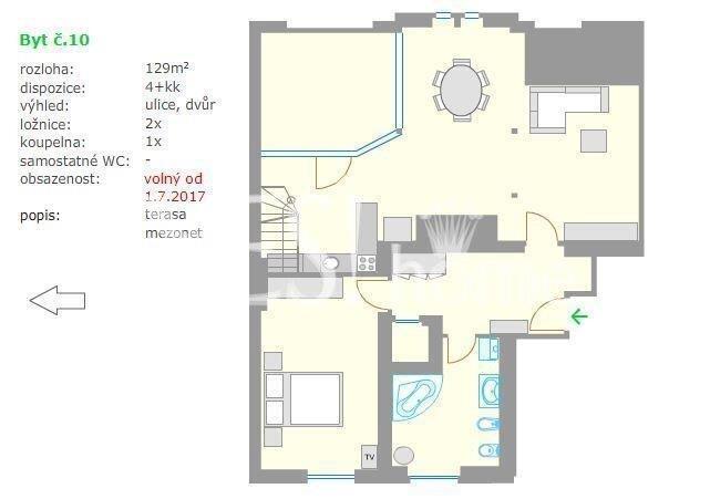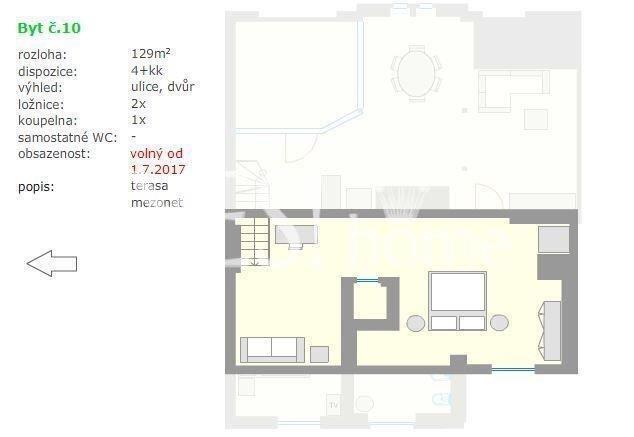 Luxusní, okouzlující, zcela nově zrekonstruovaný, komfortně zařízený, plně klimatizovaný, velmi světlý, podkrovní, mezonetový byt 4+kk s terasou a funkčním krbem, 136 m 2 (byt 129 m2 + terasa 7 m2), 5. patro s výtahem v luxusně zrekonstruovaném reprezentativním secesním domě v samém srdci Prahy nedaleko Staroměstského náměstí a nábřeží Vltavy, Truhlářská, Praha 1 - Nové Město. Ve spodní části bytu je vstupní hala s úložnými prostory, plně vybavená kuchyně s jídelnou (digestoř, sporák, pečící trouba, myčka, lednice, veškeré nádobí a sklo) spojená s obývací částí s krbem a vstupem na krásnou terasu, prostorná koupelna s vířivou vanou, pračkou a toaletou, první ložnice s vestavěnými skříněmi. V patře je druhá otevřená ložnice a pracovna. Celý apartmán je vybaven stylovým nábytkem na míru. Dřevěné trámoví dává bytu neopakovatelnou atmosféru. Na podlahách kvalitní dřevěné parketové podlahy v kombinaci s dlažbou. K dispozici TV, SAT, WIFi, alarm, videotelefon, bezpečností dveře. V domě security systém. U domu veškerá občanská vybavenost, OC Palladium, metro Náměsí Republiky, linie B či v dosahu tram.linek. Nájem 2 600 Eur/měsíc. Fixní poplatky včetně energií 550 Eur/měs. + DPH. Vratná kauce 3 měsíční nájmy. Minimální doba nájmu 6 měsíců. Volný od 1.2.2026.