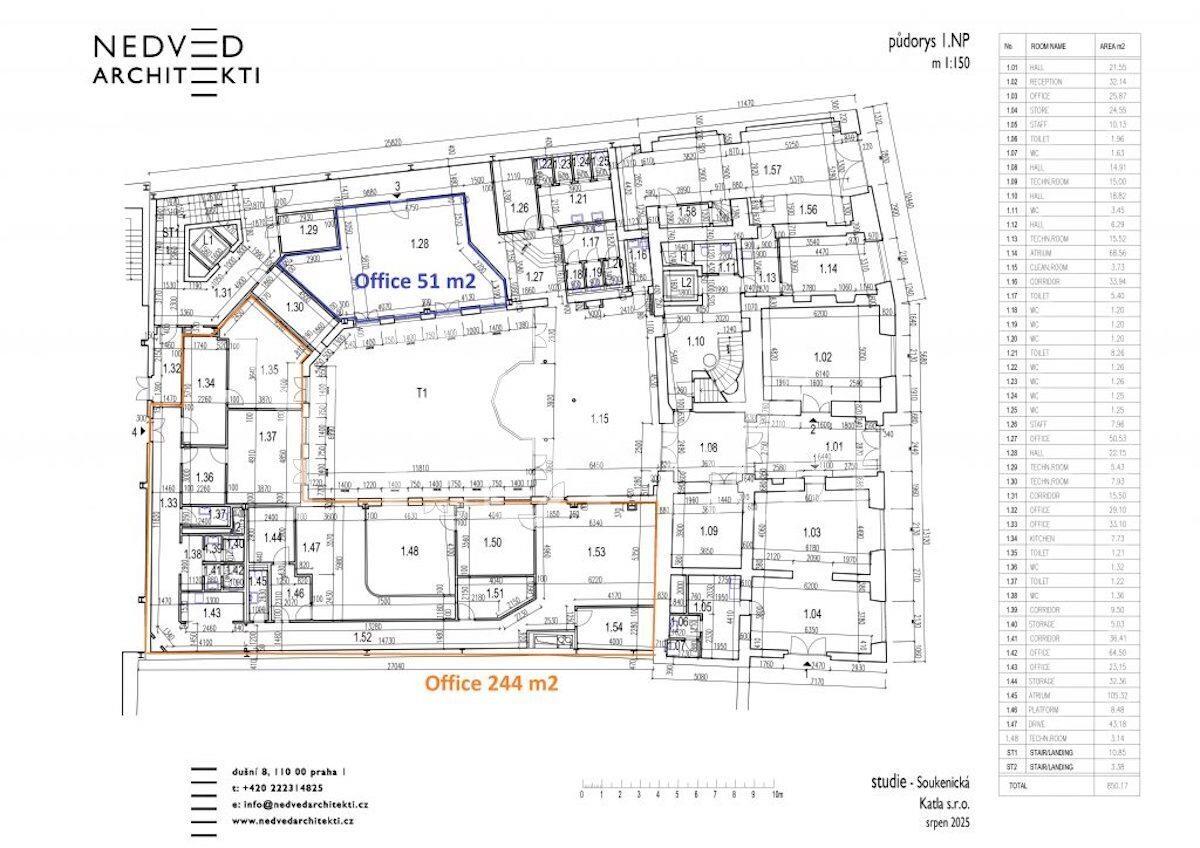 Nezařízené, plně klimatizované, kancelářské prostory, 46 m2, přízemí s výtahem reprezentativní, moderní, administrativní budovy s recepcí a ostrahou 24/7, vstupem na magnetické karty, rychlým internetem s optickým připojením a podzemním parkingem, na prestižní adrese v klidné části centra, Soukenická, Prahy 1 - Nové Město. Ideální pro e-shop. Bez kuchyňky. Společné toalety na patře. Na podlahách koberce, laminátové podlahy a dlažba. Možnost výběru i rozměrově jiné varianty kanceláří dle aktuální nabídky. U domu tram. Revoluční, metro Náměstí Republiky, linie B. K dispozici jsou až 4 parkovací stání za extra příplatek 6 000 Kč + DPH/1 stání/měsíc. Nájem 509,70 EUR + DPH (10 EUR/m2). Poplatky 7 135,80 Kč + DPH (zálohy na služby 140 Kč / m2) + elektřina. Vratná kauce 2 měsíční nájmy. Volné ihned.