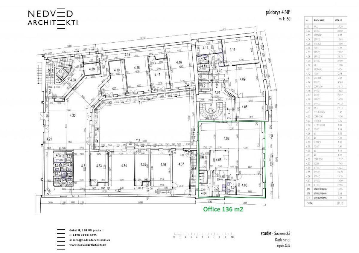 Nezařízené, plně klimatizované, kancelářské prostory, 136,20 m2, 3. patro s výtahem reprezentativní, moderní, administrativní budovy s recepcí a ostrahou 24/7, vstupem na magnetické karty, rychlým internetem s optickým připojením a podzemním parkingem, na prestižní adrese v klidné části centra, Soukenická, Prahy 1 - Nové Město. Prostor disponuje plně vybavenou kuchyňkou a 2 toaletami. Dřevěné parketové podlahy a dlažba. Možnost výběru i rozměrově jiné varianty kanceláří dle aktuální nabídky. U domu tram. Revoluční, metro Náměstí Republiky, linie B. K dispozici jsou až 4 parkovací stání za extra příplatek 6 000 Kč + DPH/1 stání/měsíc. Nájem 1 906,80 EUR + DPH (14 EUR/m2). Poplatky 19 068 Kč + DPH (140 Kč/ m2) + elektřina. Vratná kauce 2 měsíční nájmy. Volné ihned.