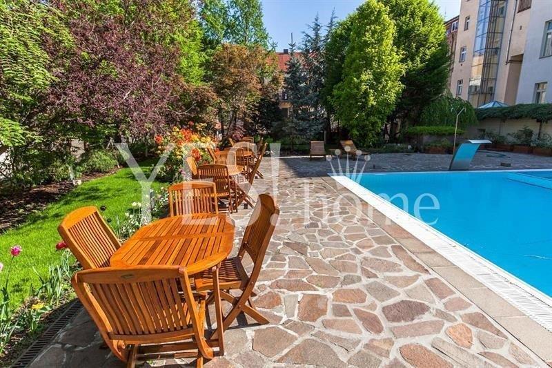 Luxury, air-conditioned, fully furnished 1 bedroom apartment overlooking to beautiful garden with heated swimming pool, 71 sqm, 2nd floor with elevator in prestigious completely new renovated Neo-Renaissance building in residential area, Italská street, Praha 2 - Vinohrady. The apartment offers entrance hall with storage space, large living room with TV, seating area, dining area and fully equipped kitchen (hood, stove, oven, dishwasher, refrigerator, washer and dryer), separate bedroom with double bed and TV with private bathroom (corner bath tub, toilet, bidet), second guest toilet with entrance from the hall and practical dressing room. Quality wooden parquet floors combined with tile, video intercom, SAT TV, 24/7 reception, nice garden, swimming pool with hydro massage, sauna, garden barbecue, parking. Perfect location, next metro Naměstí Míru, line A, metro I.P. Pavlova, line C, tram. or bus lines, just 5 minutes walk from Václavské náměstí, near Riegrovy sady. Rent 1 600 Eur/month. Fixed bills including energy 450 Eur/month + VAT. Parking for extra fee from 5 000 CZK + VAT. Deposit 2 monthly rents. Minimum rental period 6 months.Available immediately.