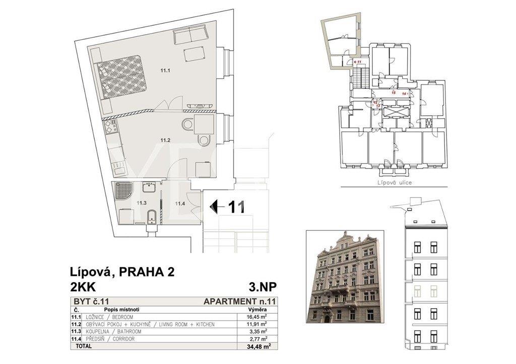 Luxury, unfurnished, one bedroom apartment to rent, 34 sqm, Lípová, Praha 2 - Nové Město