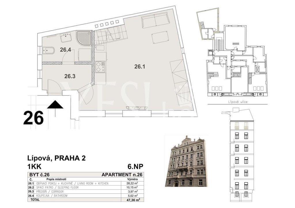 Luxury, new renovated, attic, duplex, fully air-conditioned, unfurnished, 1 bedroom apartment, 47,36 sqm, 5th and 6th floor with new modern elevator of new renovated Art Nouveau building near Václavské náměstí, Lípová str., Praha 2 - Nové Město. The apartment is oriented to quiet green courtyard on the south side. The apartment offers entrance hall, living room with large French windows and fully equipped kitchen (cooker hood, ceramic hob, electric oven, dishwasher, fridge, washing machine), upstairs bedroom, bathroom with shower and toilet. Quality parquet floors combined with tiles, own new gas boiler Vaillant (water heating, heating), security door, intercom. Next the house tram. st. Štěpánská, near metro st. I.P. Pavlova, line C or metro st. Karlovo náměstí, line B. Bills 1 500 CZK/person + energy will be transfer to the tenant. Refundable deposit 2 monthly rents. Available immediately.