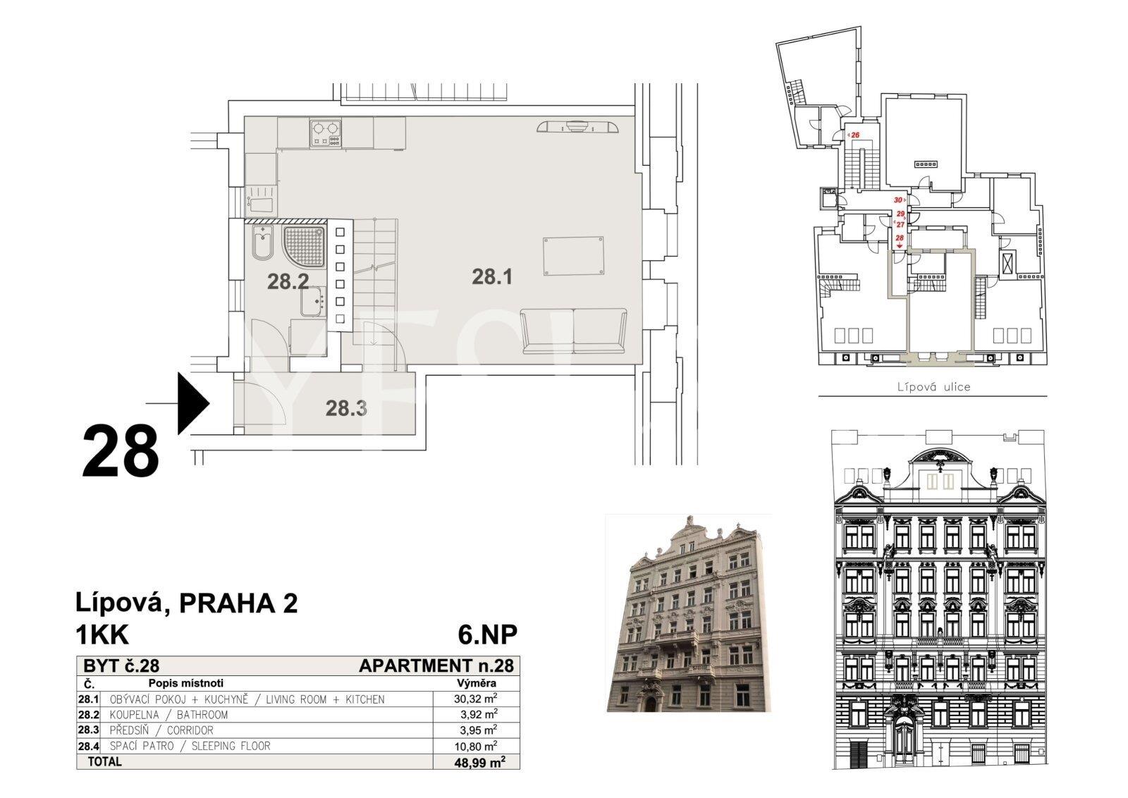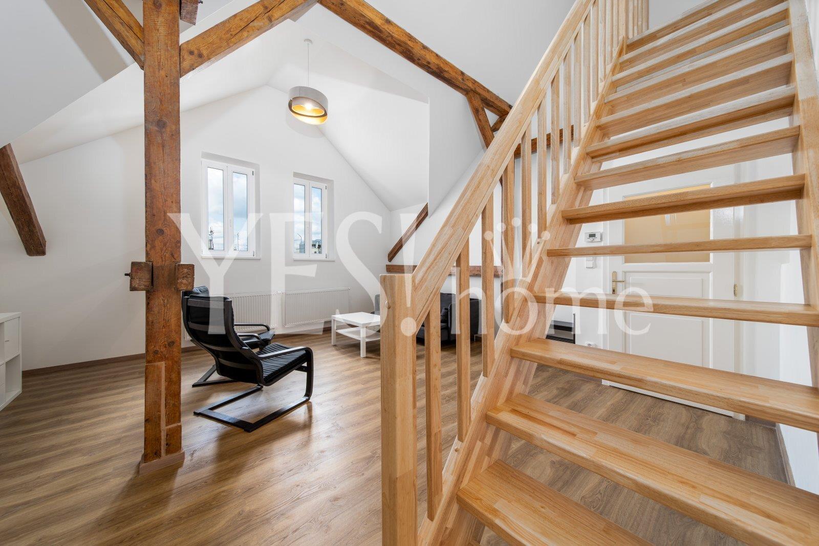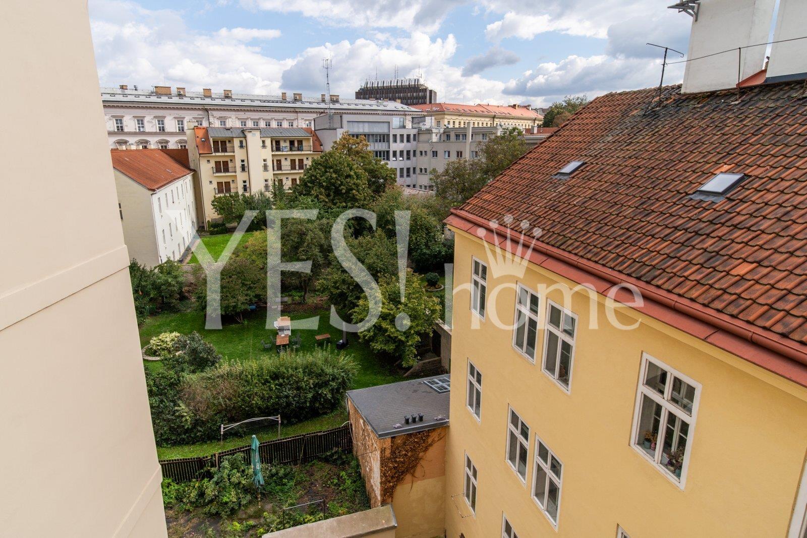 Luxury, new renovated, duplex, furnished, 1 bedroom apartment, 48,99 sqm, 5th and 6th floor with new modern elevator of new renovated Art Nouveau building near Václavské náměstí, Lípová str., Praha 2 - Nové Město. The apartment offers an entrance hall, living room with fully equipped kitchen (extractor hood, ceramic hob, electric oven, dishwasher, refrigerator, washing machine), separate bedroom upstairs and bathroom with shower and toilet. Quality parquet floors combined with tiles, own new gas boiler Vaillant (water heating, heating), security door, intercom. Next the house tram. st. Štěpánská, near metro st. I.P. Pavlova, line C or metro st. Karlovo náměstí, line B. Bills 1 700 CZK/person + energy will be transfer to the tenant. Refundable deposit 2 monthly rents. Available from 1.10.2025.