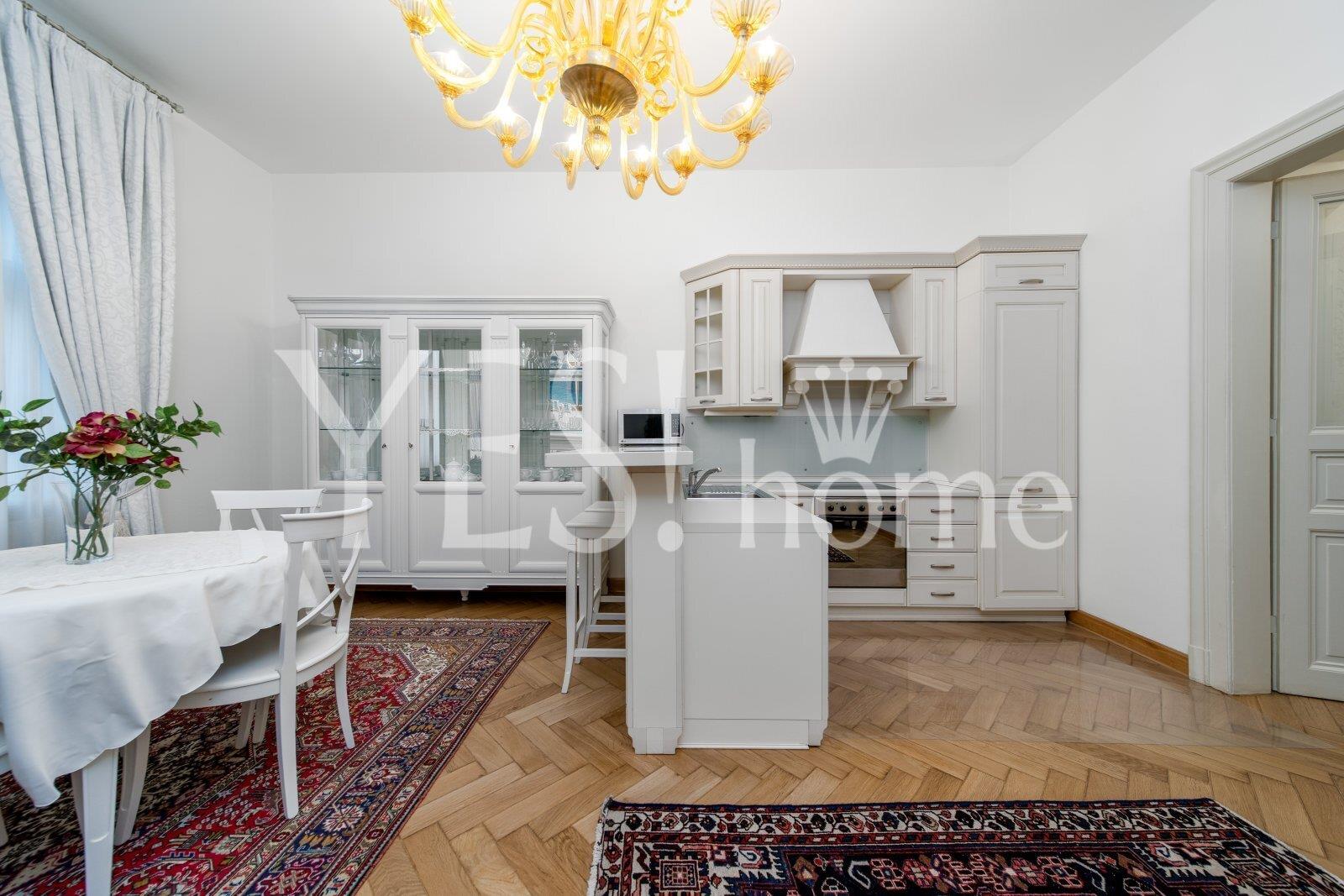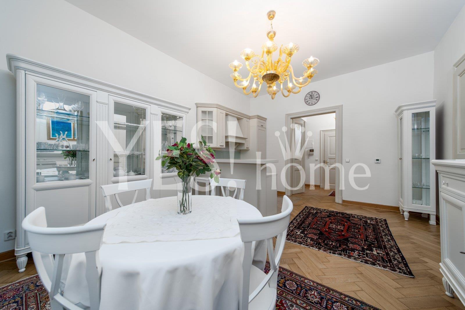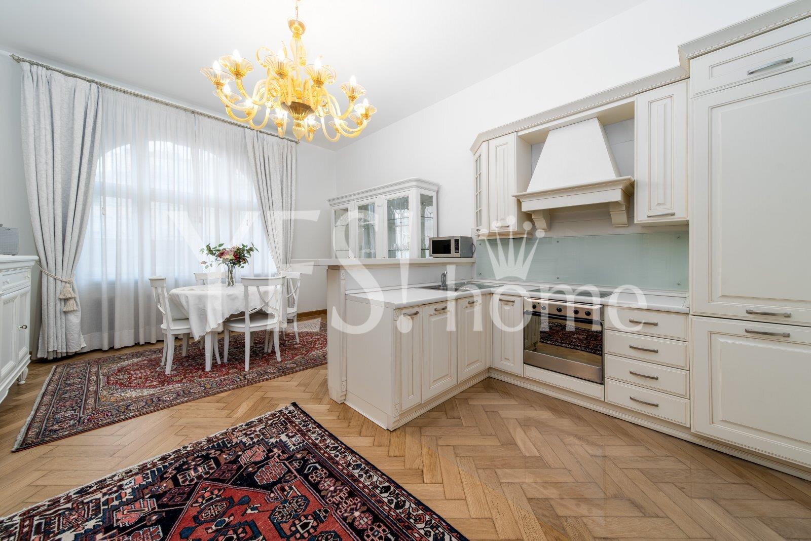 Luxury, fully furnished, very bright, 2 bedroom apartment, 78,60 sqm, 4th floor with elevator in luxury renovated Art Nouveau representative building in the heart of Prague near Staroměstské náměstí and the Vltava river, Truhlářská street, Praha 1 - Nové Město. The apartment offers entrance hall with storage, fully equipped kitchen with dining area (hood, stove, oven, dishwasher, refrigerator, all crockery and glassware), 2 separate bedrooms with TV (1 bedroom, living room), bathroom with tub, toilet, bidet and washing machine. The whole apartment is equipped with stylish furniture. Wooden beams gives the apartment unique atmosphere. Quality wooden parquet floors in combination with tiles. Available TV, SAT, WiFi, alarm, video intercom, security door. The home security system. All the amenities, OC Palladium, metro Náměstí Republiky, line B or tram. lines. Rent 1 600 Eur/month. Fixed bills including energy 450 Eur/month + VAT. Refundable deposit 2 monthly rents. Minimum rental period 6 months. Available immediately.