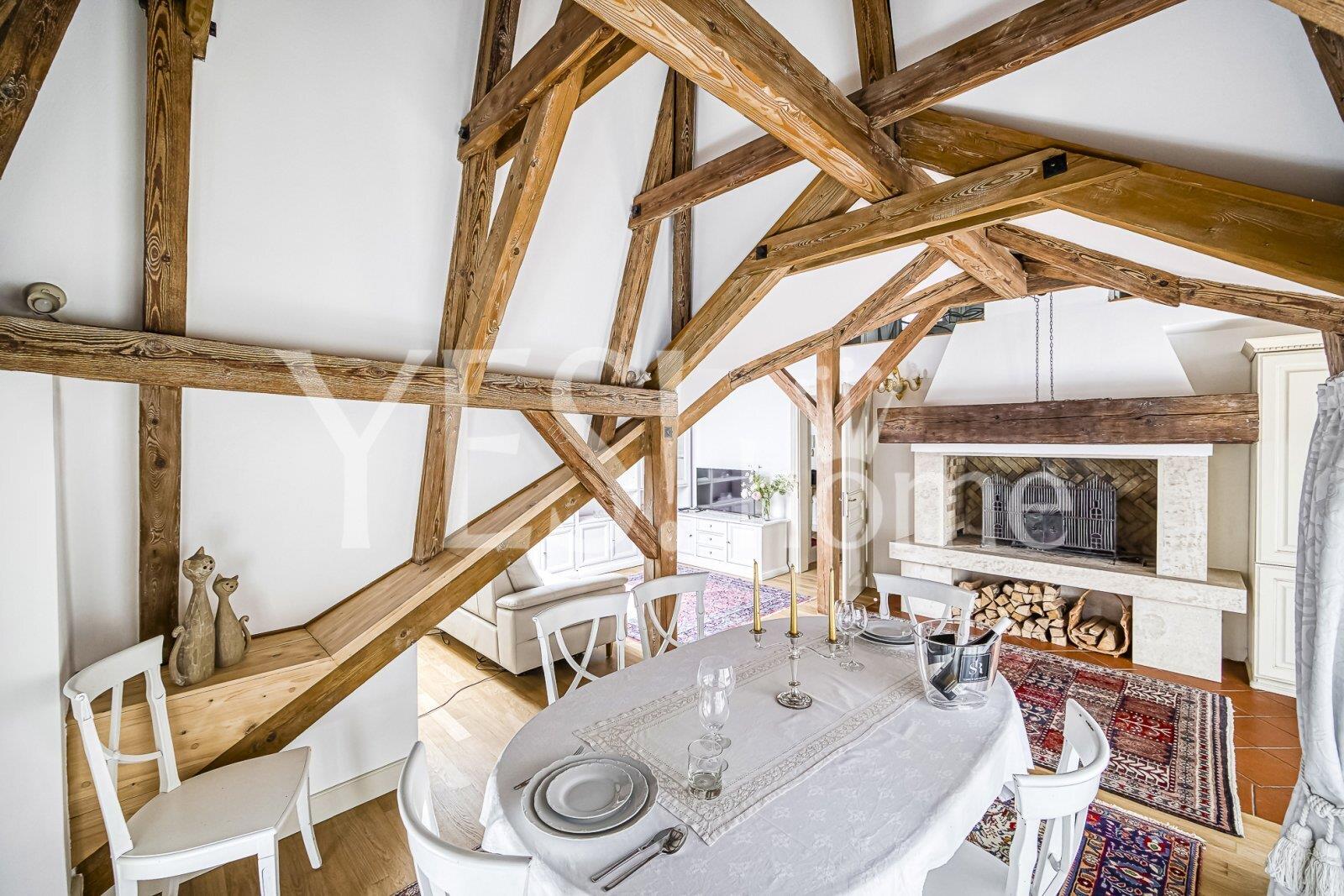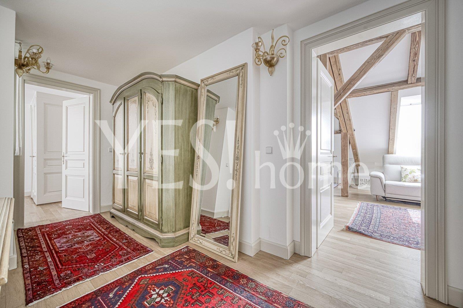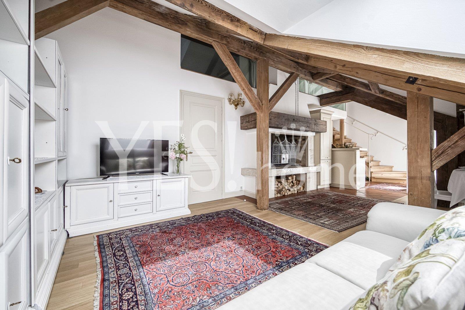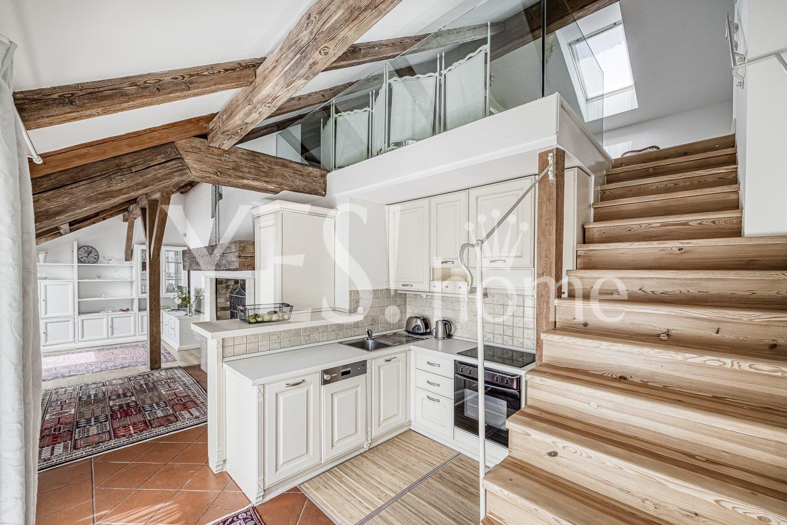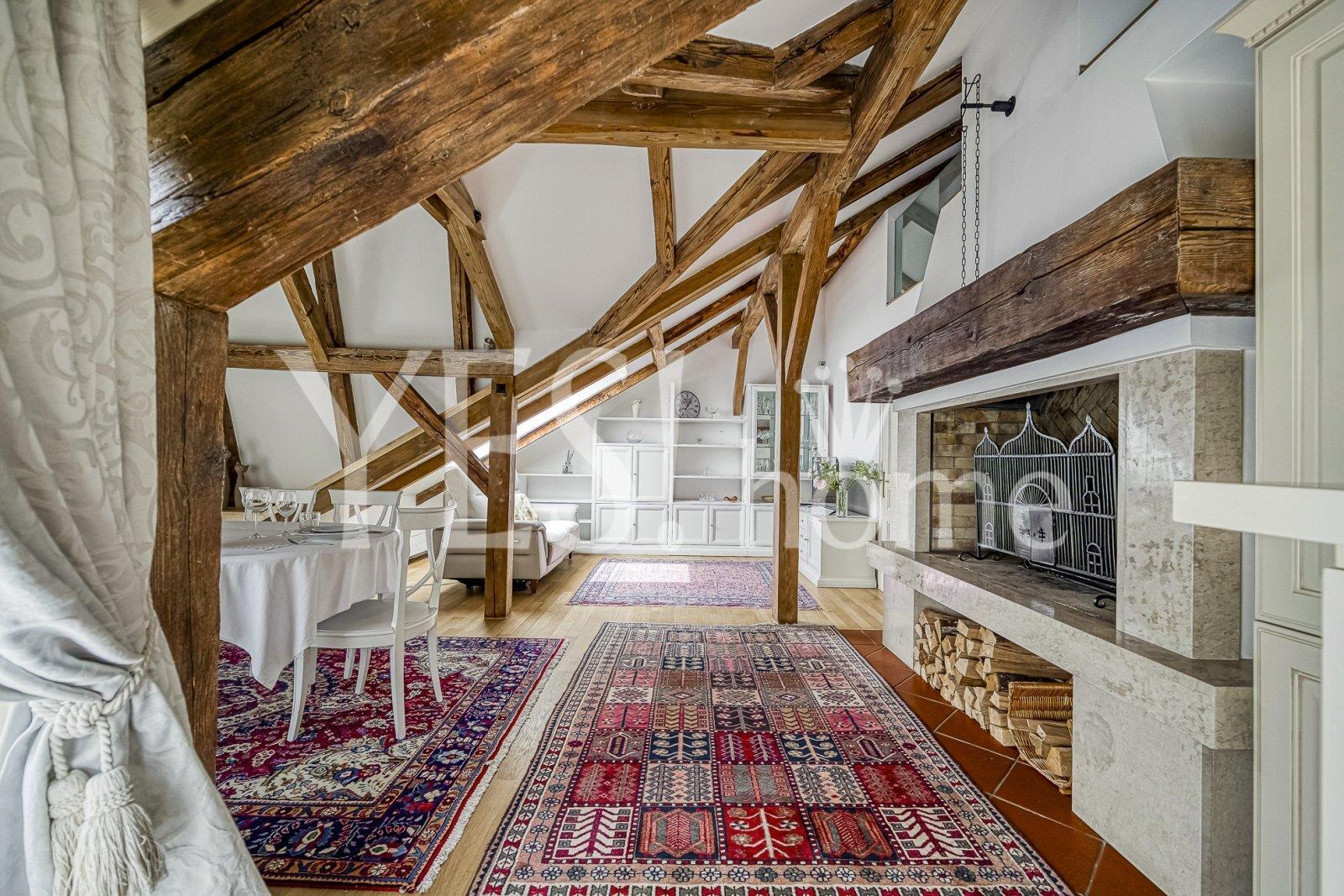Luxury, charming, completely new renovated, comfortably furnished, fully air-conditioned, very bright, attic, duplex, 3 bedroom apartment with terrace and functional fireplace, 136 sqm (apt. 129 sqm + terrace 7 sqm), 5th floor with elevator in luxury renovated Art Nouveau representative building in the heart of Prague near Staroměstské náměstí and the Vltava river, Truhlářská street, Praha 1 - Nové Město. The apartment offers entrance hall with storage, fully equipped kitchen with dining room (hood, stove, oven, dishwasher, refrigerator, all crockery and glassware) with living area with fireplace and access to beautiful terrace, spacious bathroom with whirlpool tub, washing machine and toilet, first bedroom with wardrobes. The second floor offers open second bedroom and study. The whole apartment is equipped with stylish furniture. Wooden beams gives the apartment unique atmosphere. Quality wooden parquet floors in combination with tiles. Available TV, SAT, WiFi, alarm, video intercom, security door. The home security system. All the amenities, OC Palladium, metro Náměstí Republiky, line B or tram. lines. Rent 2 600 Eur/month. Fixed bills including energy 450 Eur/month + VAT. Deposit 3 monthly rents. Minimum rental period 6 months. Available from 1.2.2026.