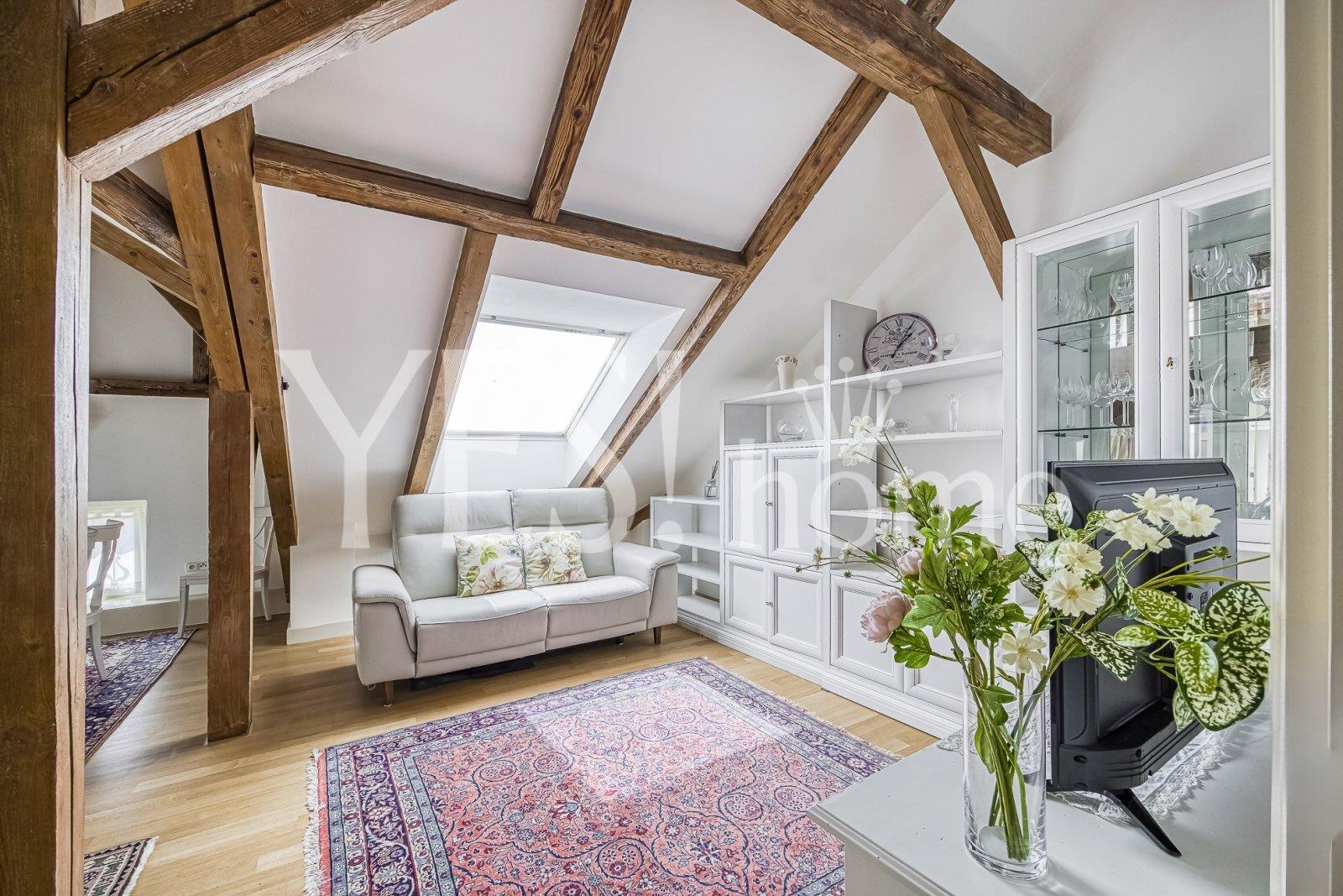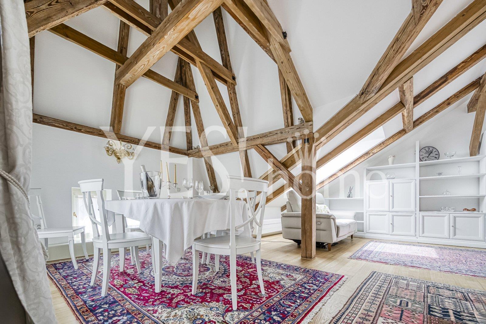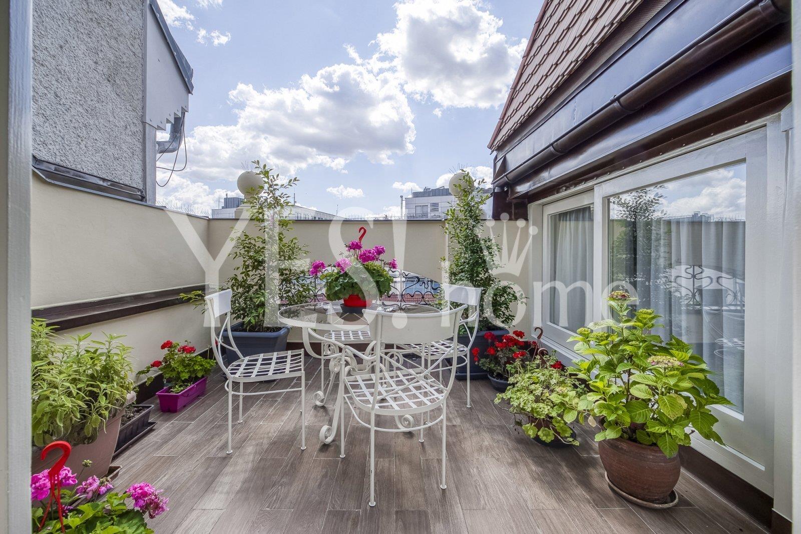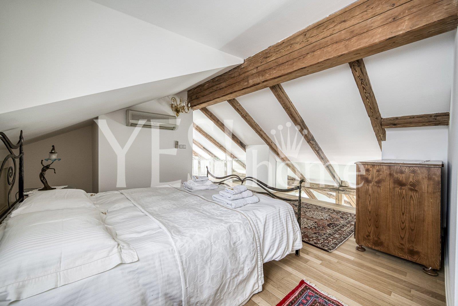 Luxury, charming, completely new renovated, comfortably furnished, fully air-conditioned, very bright, attic, duplex, 3 bedroom apartment with terrace and functional fireplace, 136 sqm (apt. 129 sqm + terrace 7 sqm), 5th floor with elevator in luxury renovated Art Nouveau representative building in the heart of Prague near Staroměstské náměstí and the Vltava river, Truhlářská street, Praha 1 - Nové Město. The apartment offers entrance hall with storage, fully equipped kitchen with dining room (hood, stove, oven, dishwasher, refrigerator, all crockery and glassware) with living area with fireplace and access to beautiful terrace, spacious bathroom with whirlpool tub, washing machine and toilet, first bedroom with wardrobes. The second floor offers open second bedroom and study. The whole apartment is equipped with stylish furniture. Wooden beams gives the apartment unique atmosphere. Quality wooden parquet floors in combination with tiles. Available TV, SAT, WiFi, alarm, video intercom, security door. The home security system. All the amenities, OC Palladium, metro Náměstí Republiky, line B or tram. lines. Rent 2 600 Eur/month. Fixed bills including energy 450 Eur/month + VAT. Deposit 3 monthly rents. Minimum rental period 6 months. Available from 1.2.2026.