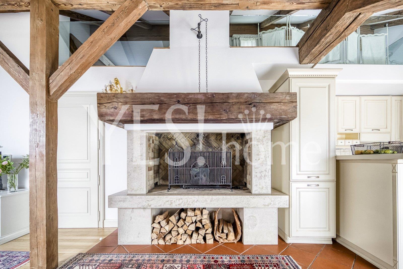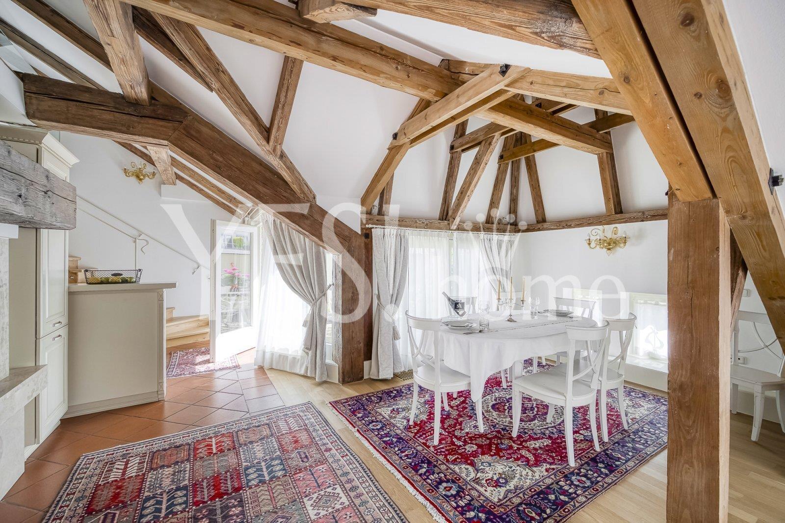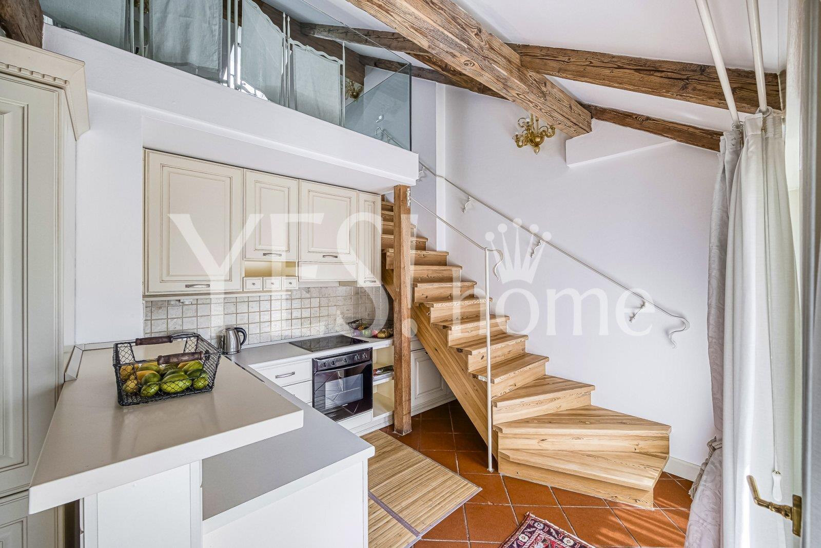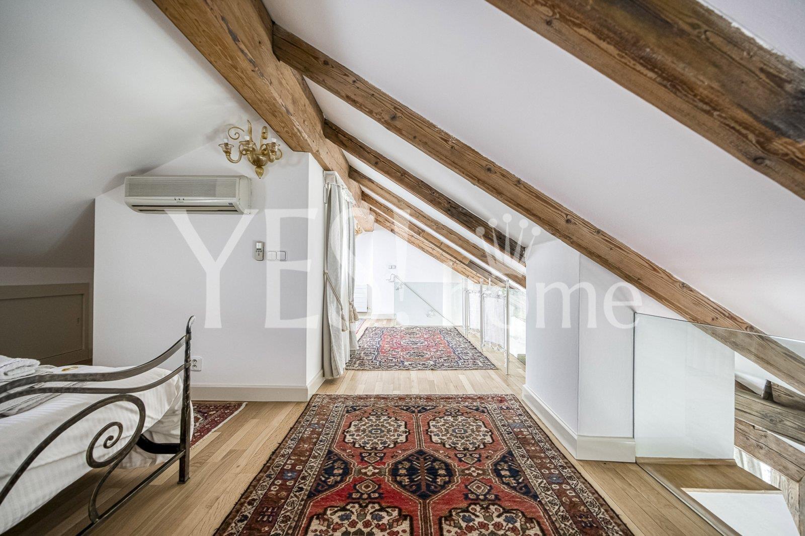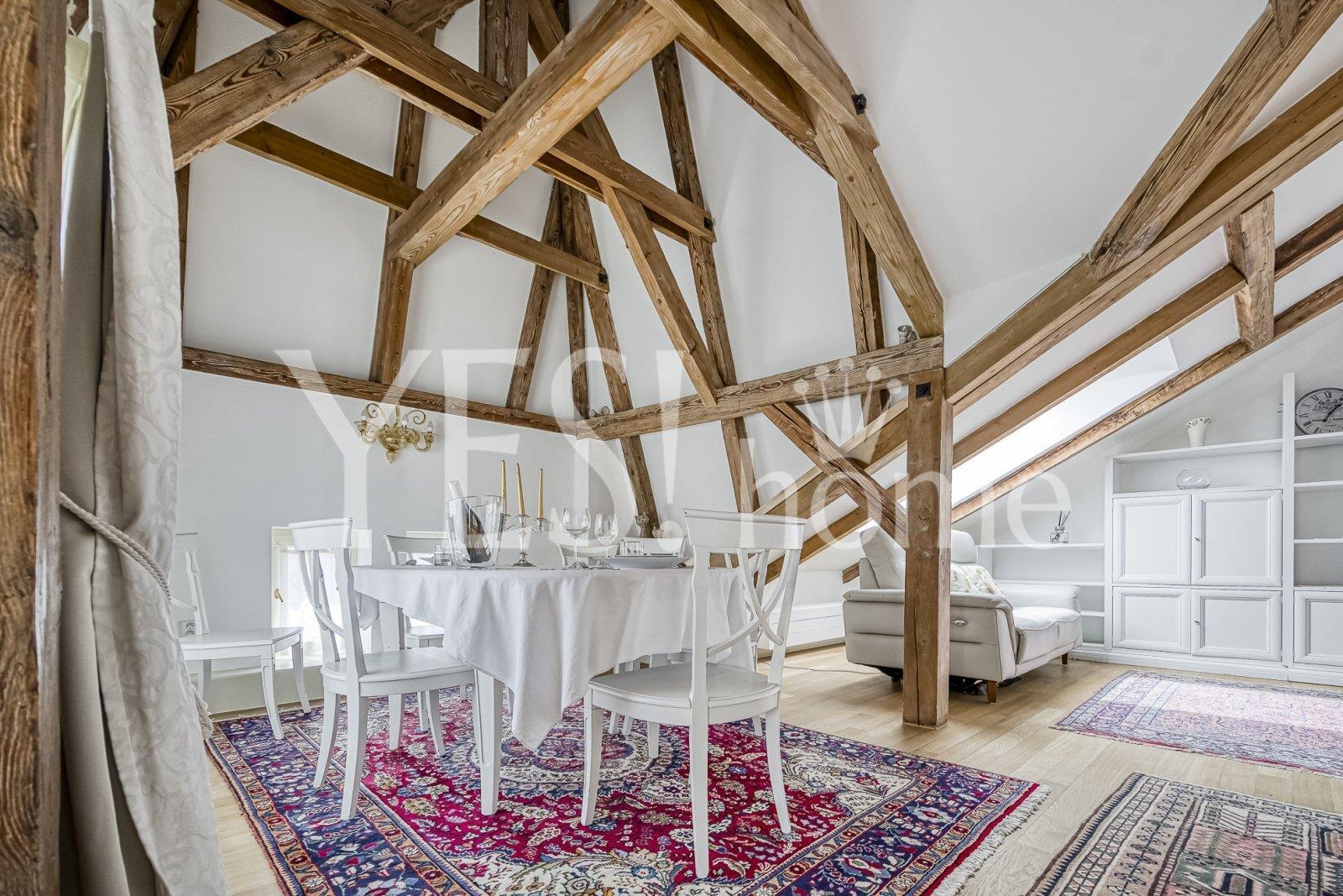 Luxury, charming, completely new renovated, comfortably furnished, fully air-conditioned, very bright, attic, duplex, 3 bedroom apartment with terrace and functional fireplace, 136 sqm (apt. 129 sqm + terrace 7 sqm), 5th floor with elevator in luxury renovated Art Nouveau representative building in the heart of Prague near Staroměstské náměstí and the Vltava river, Truhlářská street, Praha 1 - Nové Město. The apartment offers entrance hall with storage, fully equipped kitchen with dining room (hood, stove, oven, dishwasher, refrigerator, all crockery and glassware) with living area with fireplace and access to beautiful terrace, spacious bathroom with whirlpool tub, washing machine and toilet, first bedroom with wardrobes. The second floor offers open second bedroom and study. The whole apartment is equipped with stylish furniture. Wooden beams gives the apartment unique atmosphere. Quality wooden parquet floors in combination with tiles. Available TV, SAT, WiFi, alarm, video intercom, security door. The home security system. All the amenities, OC Palladium, metro Náměstí Republiky, line B or tram. lines. Rent 2 600 Eur/month. Fixed bills including energy 450 Eur/month + VAT. Deposit 3 monthly rents. Minimum rental period 6 months. Available from 1.2.2026.