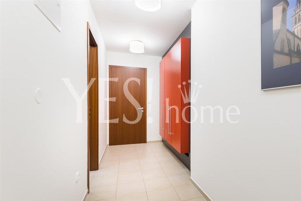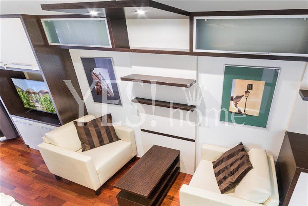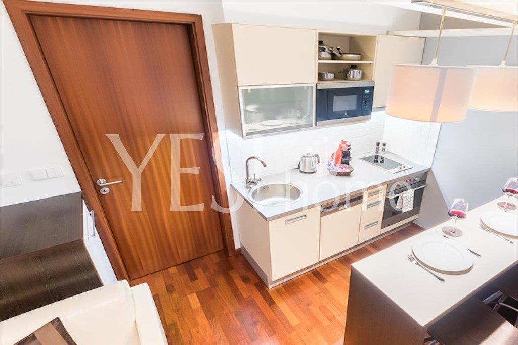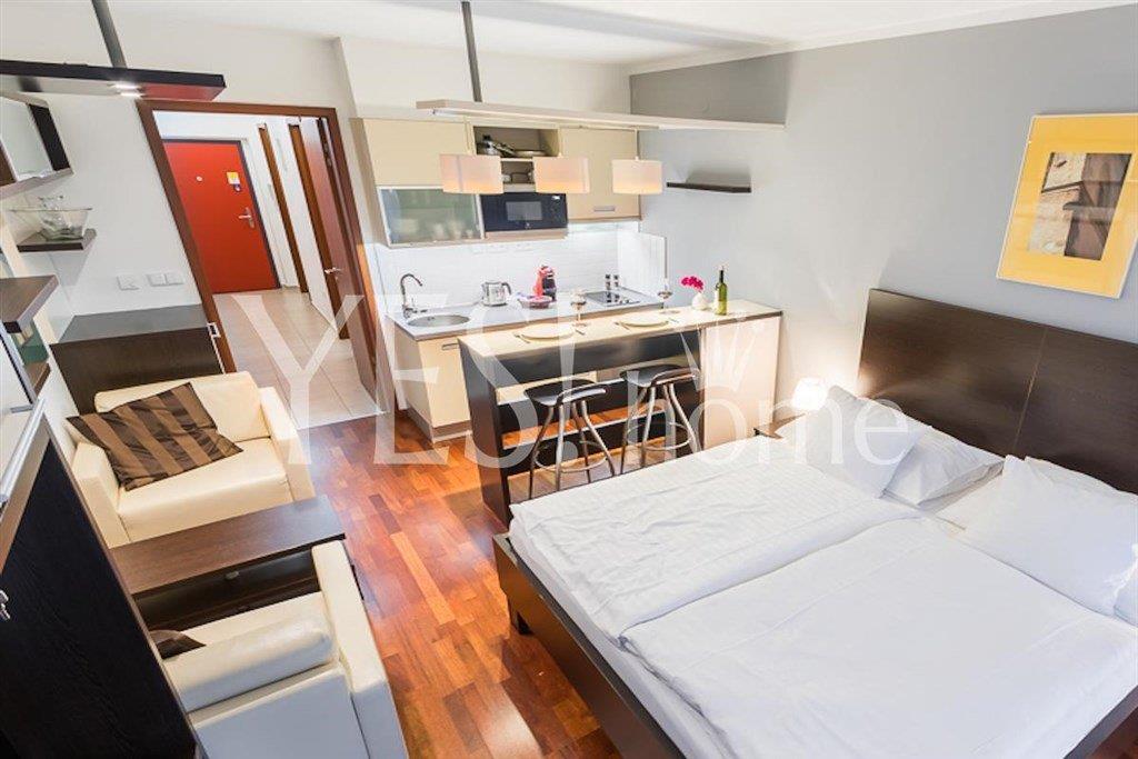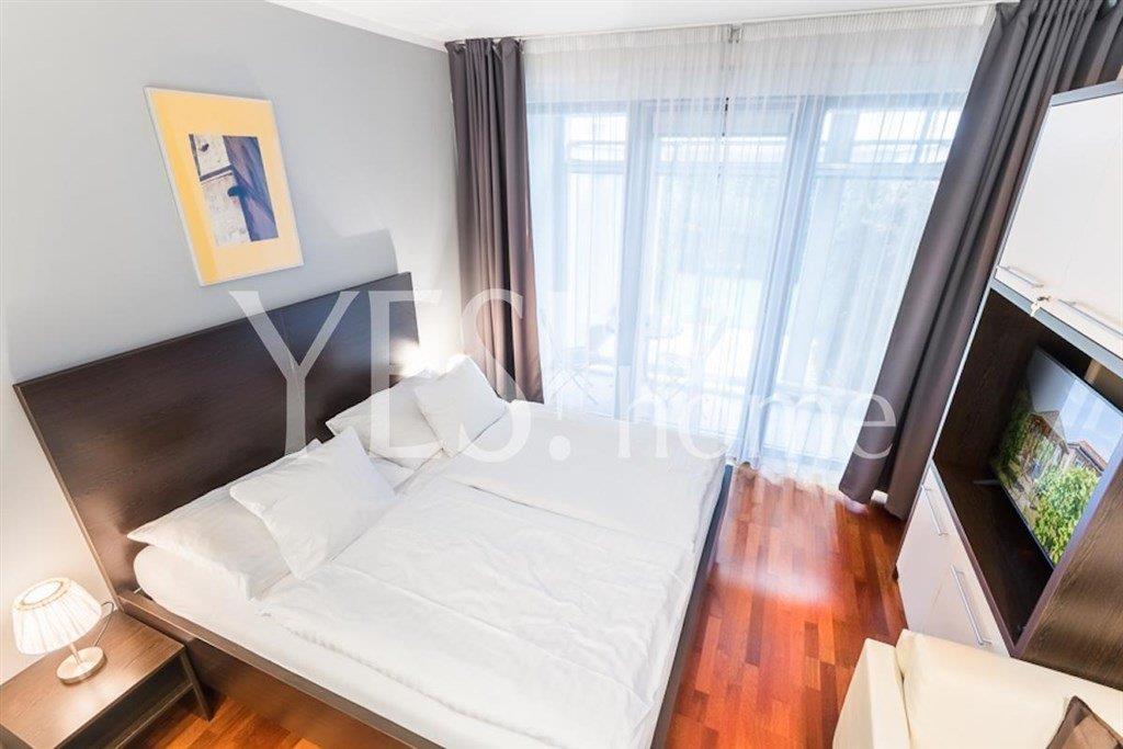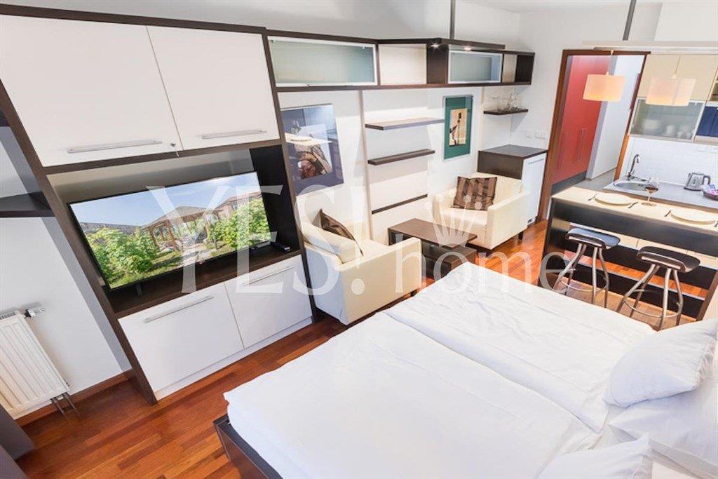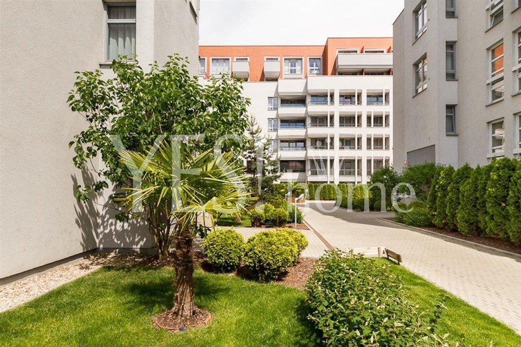 Luxury, stylishly furnished studio apartment with balcony and garden, 57 sqm (apt. 36 sqm + balcony 3 sqm + garden 18 sqm) on the ground floor with elevator of new building with 24/7 reception and underground parking in lucrative location under Vyšehrad, Na Slupi street, Praha 2 - Nové Město. The apartment offers entrance hall with built-in wardrobes, living room with fully equipped kitchen (hood, stove, oven, microwave, dishwasher, fridge), sleeping section with double bed, bathroom with shower, washer/dryer and toilet, large chamber, balcony facing the garden, picturesque garden with partial roof and summer seating. Quality parquet floors combined with tiles, underfloor heating throughout the apartment. TV/Satellite, high-speed free Wi-Fi. Near the house tram. st. Albertov, only 8 minutes tram from Václavské náměstí, near metro st. Vyšehrad, line C or metro st. Karlovo náměstí, line B. Parking for extra charge. Rent 23 000 CZK including fixed payments for servicing common areas 2 000 CZK/month + billable advance payments for energy in the apartment 4 000 CZK/month. Refundable deposit 1,5 monthly rent. Minimum rental period 6 months. Available immediately.