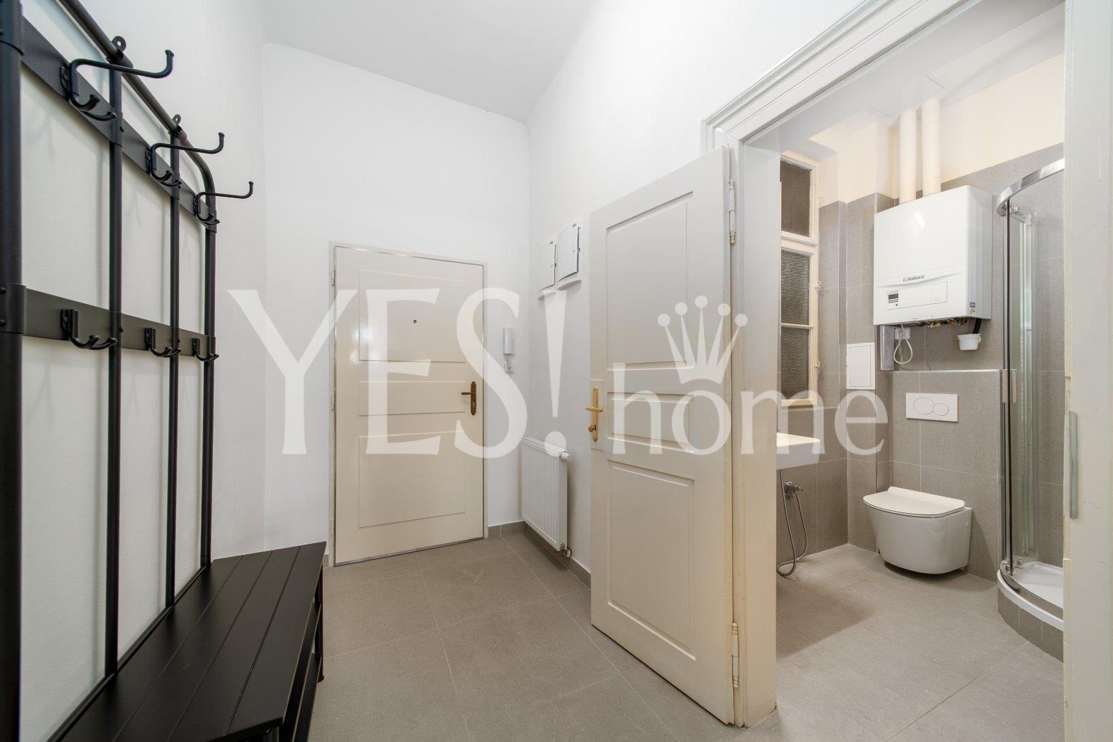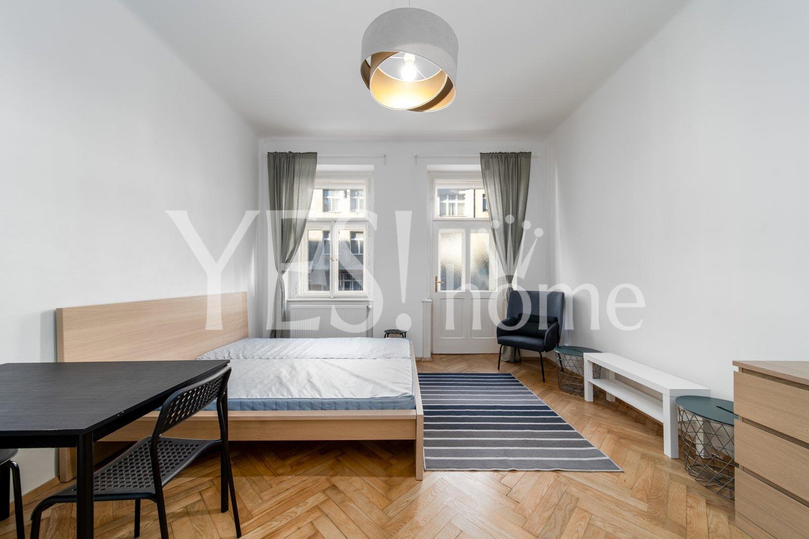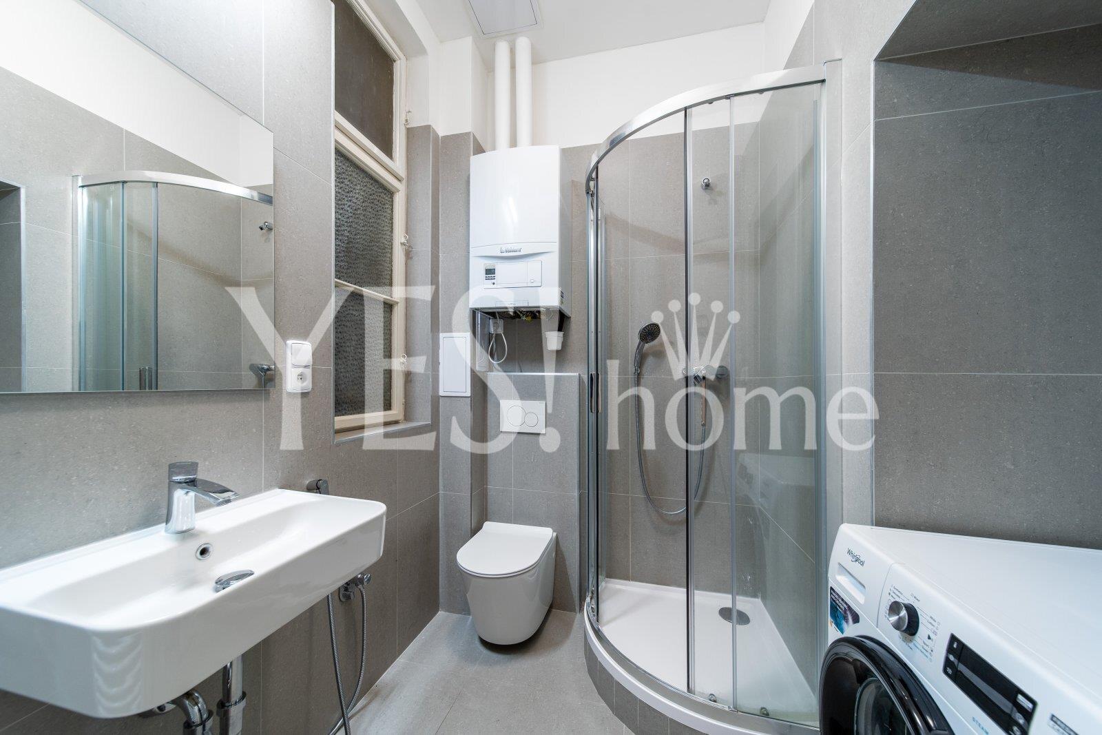 Luxury, new renovated, cozy, fully furnished, studio apartment with balcony, 33,47 sqm (apt. 32,03 sqm, balcony 1,44 sqm), 1st floor with new modern elevator of new renovated Art Nouveau building near Václavské náměstí, Lípová str., Praha 2 - Nové Město. The apartment faces the street on the west side. The apartment offers entrance hall, room with fully equipped kitchen (extractor hood, ceramic hob, electric oven, dishwasher, refrigerator, washing machine) and entrance to the balcony, bathroom with shower and toilet. Quality parquet floors combined with tiles, own new gas boiler Vaillant (hot water, heating), security door, intercom. Next the house tram. st. Štěpánská, near metro st. I.P. Pavlova, line C or metro st. Karlovo náměstí, line B. Bills 1 700 CZK/person + energy will be transfer to the tenant. Refundable deposit 2 monthly rents. Available immediately. I recommend!